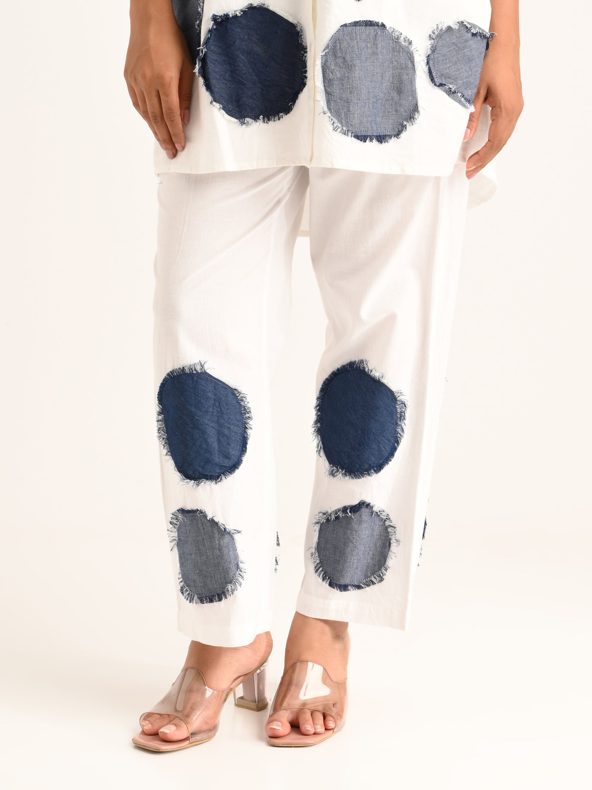 A crisp and contemporary co-ord set featuring bold indigo polka-style prints on a clean white base. The shirt-style top with a relaxed silhouette pairs seamlessly with straight-fit pants, making it perfect for modern, fuss-free dressing with a hint of artistic flair.