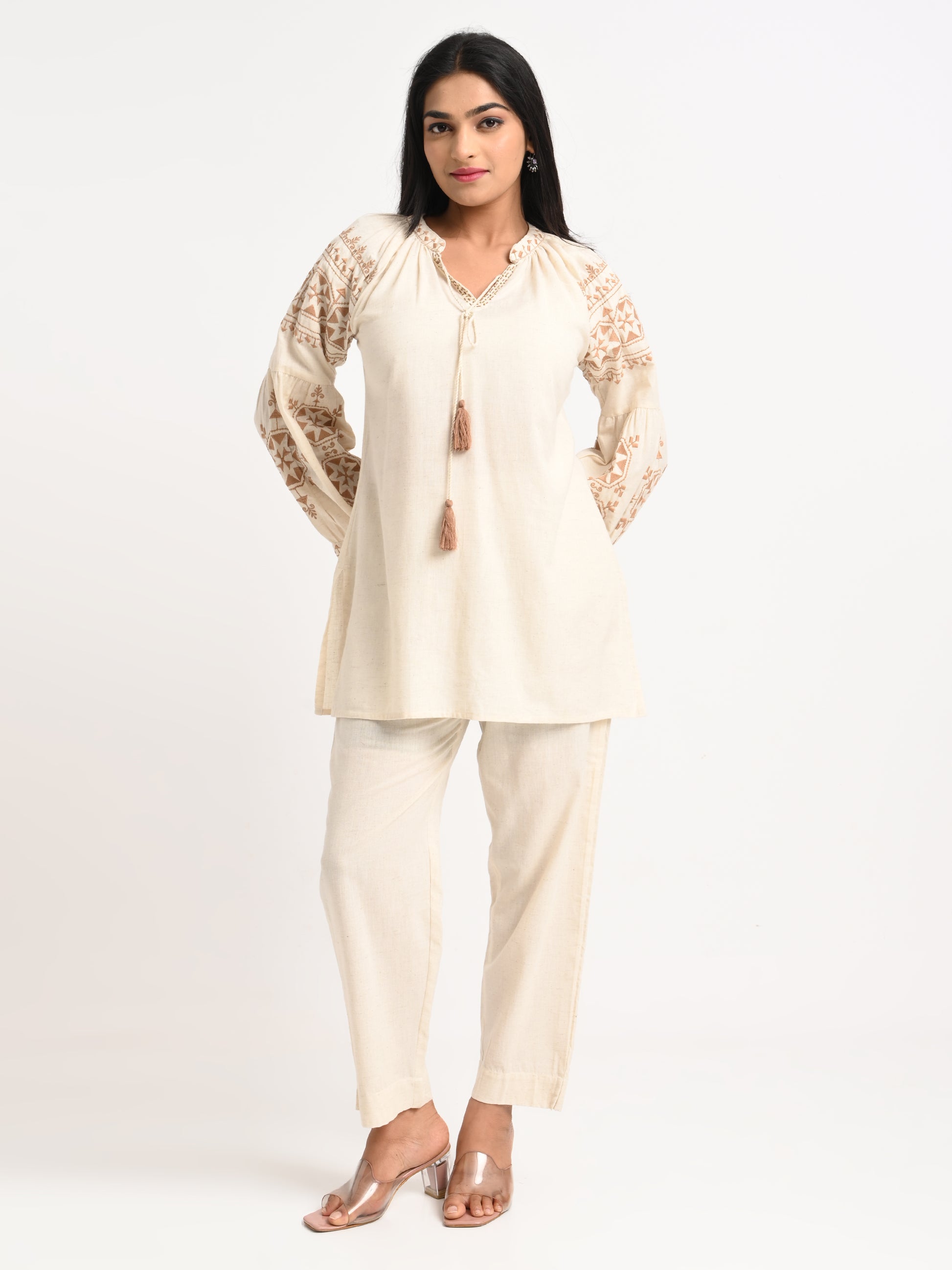 A chic cotton co-ord set featuring a straight top with detailed embroidery on the sleeves, paired with matching straight pants. Perfect for casual wear and semi-formal occasions with a modern ethnic touch.