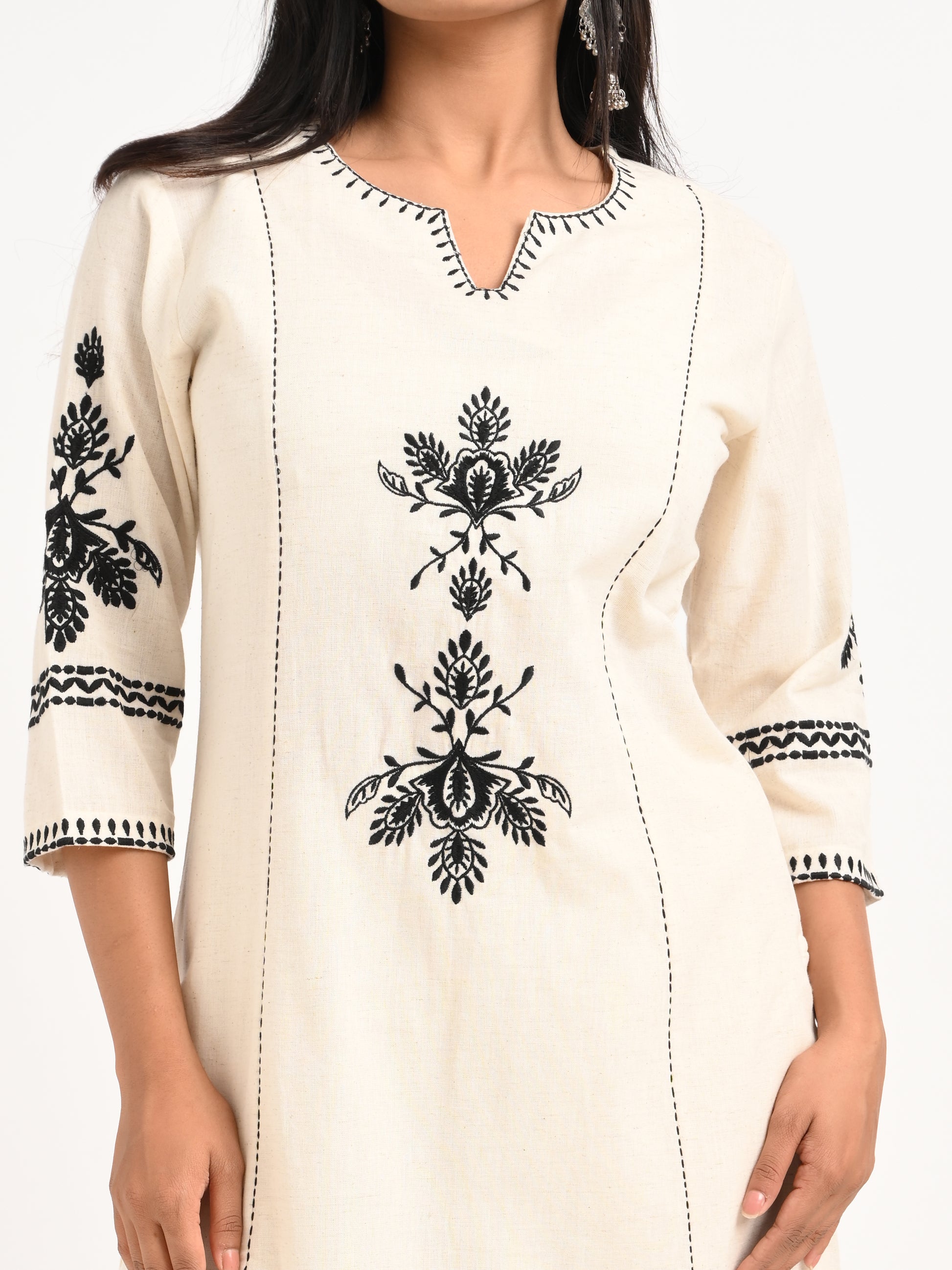 A cream-toned kurta set with contrasting black thread embroidery on the yoke and sleeves, finished with embroidered borders on the straight pants. A chic blend of subtle elegance and ethnic charm, suitable for casual and semi-formal wear.