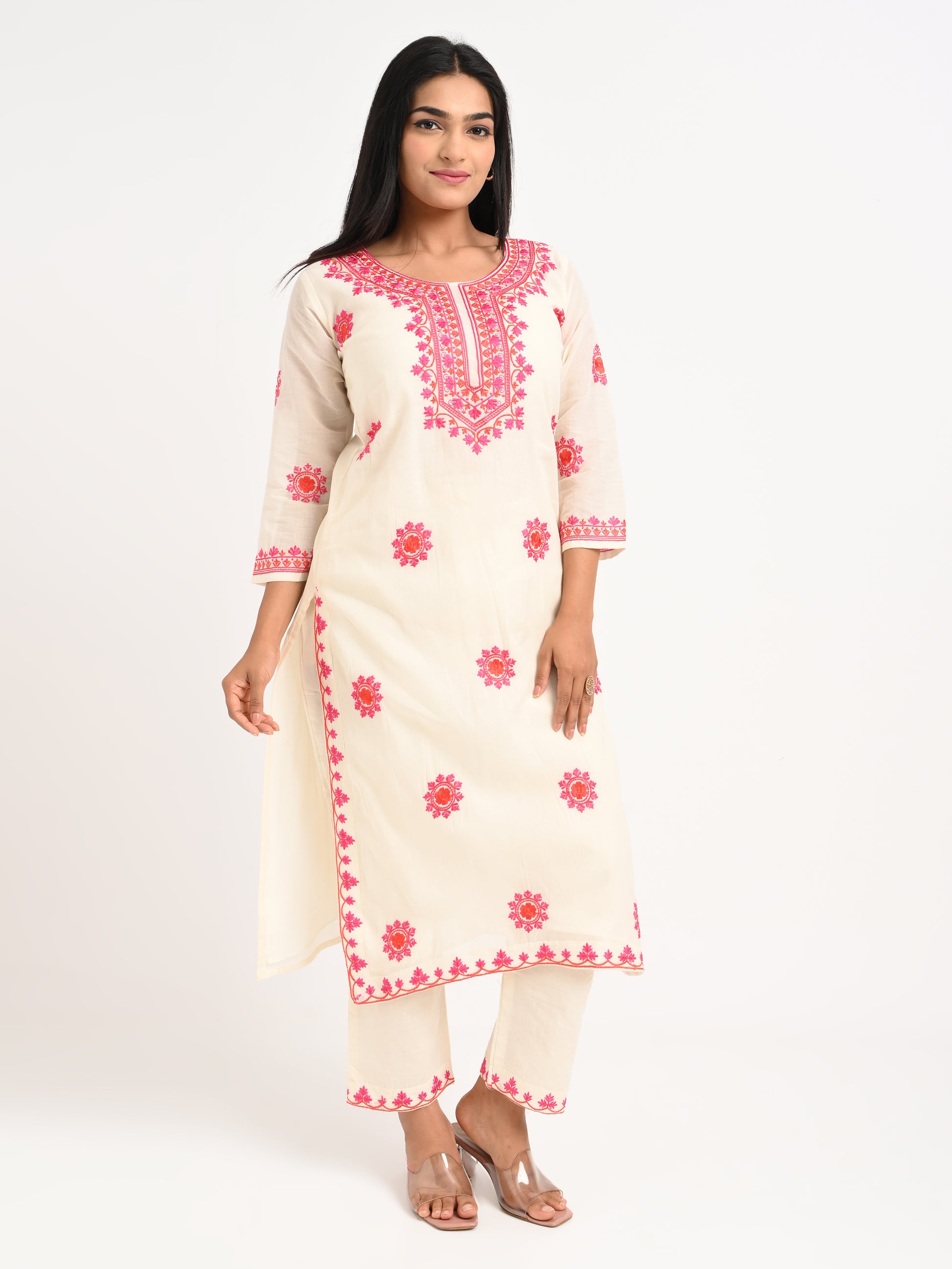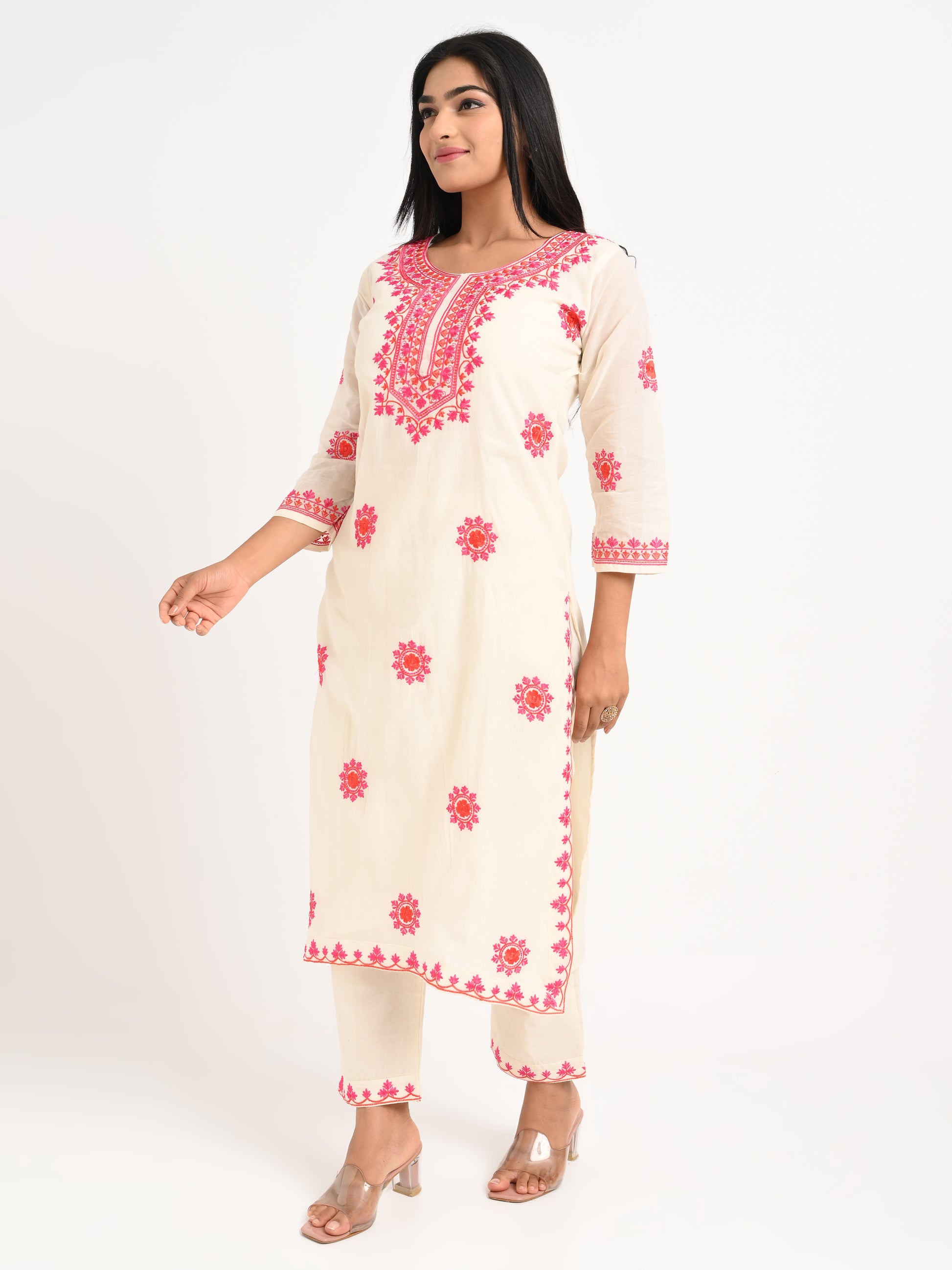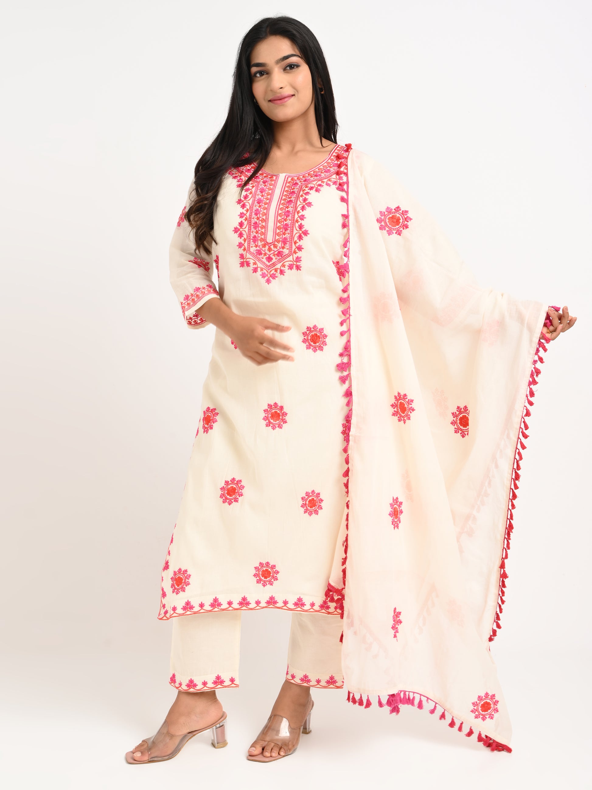 A cream-colored kurta set with vibrant pink floral embroidery, featuring a straight kurta with three-quarter sleeves, paired with matching pants and a dupatta adorned with tassel detailing. A graceful choice for festive and casual occasions