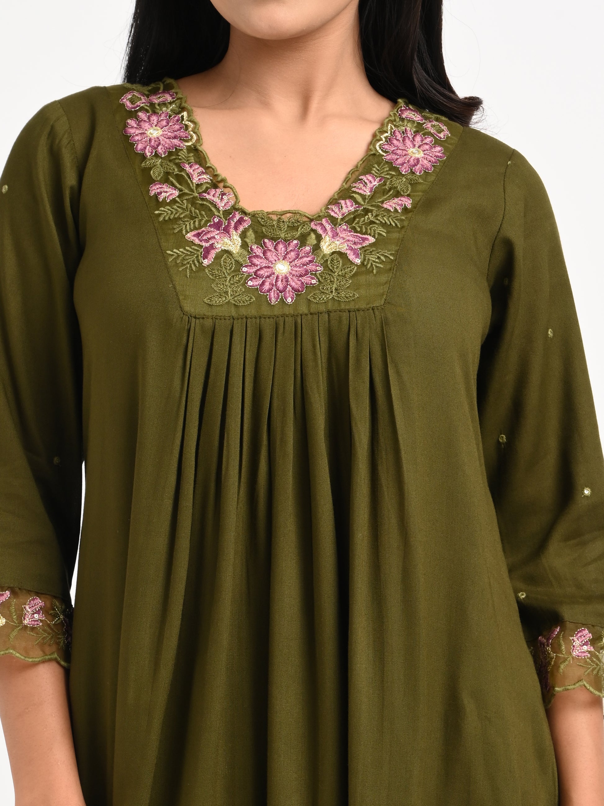 A graceful muslin kurta set featuring delicate embroidery on the neckline and sleeves, paired with matching straight pants and a beautifully embroidered dupatta. Perfect for festive occasions and gatherings, offering comfort with elega