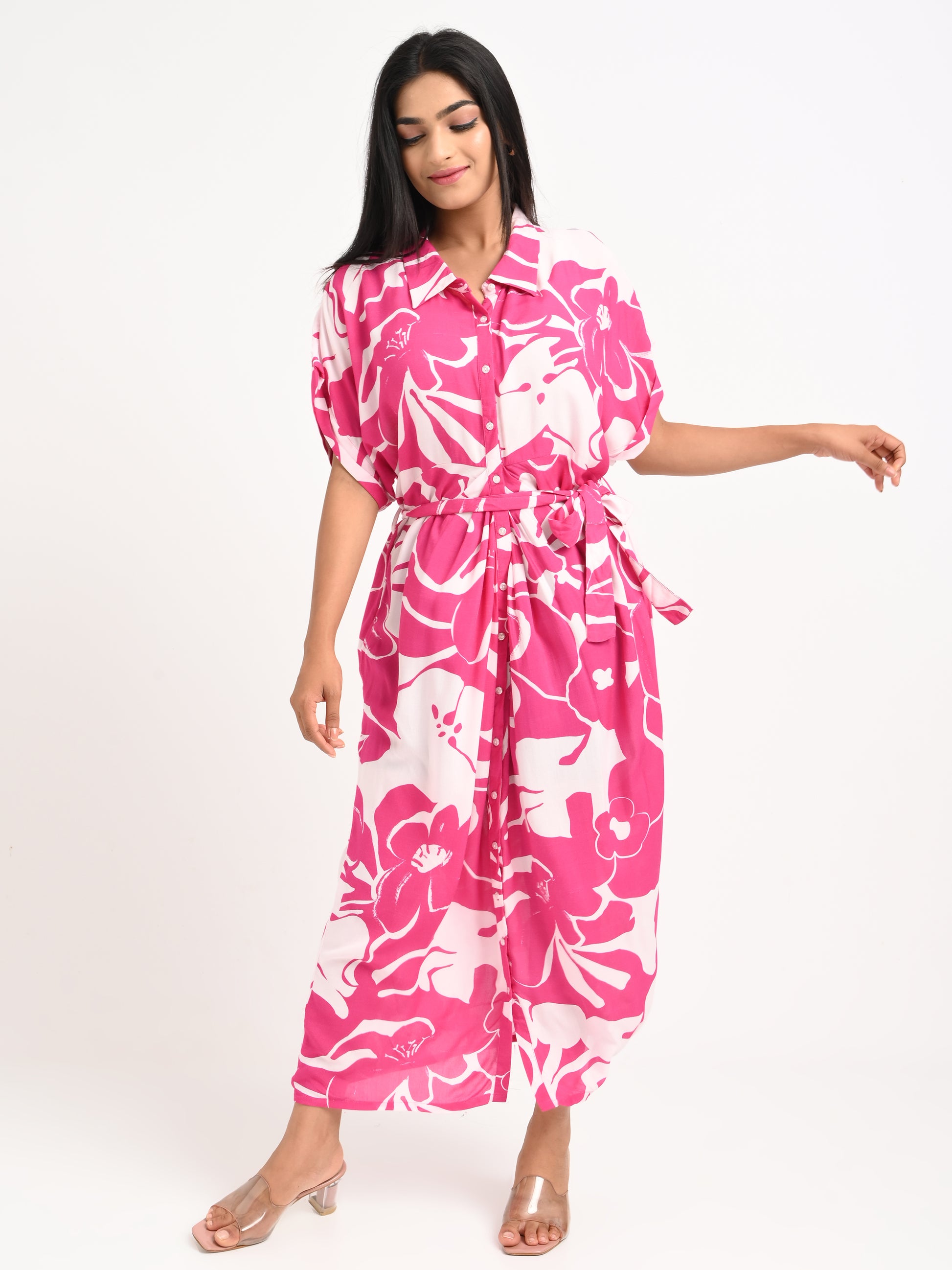 An effortlessly refined kaftan dress adorned with an oversized floral print in striking pink and white hues—crafted for elevated daytime and vacation wear.