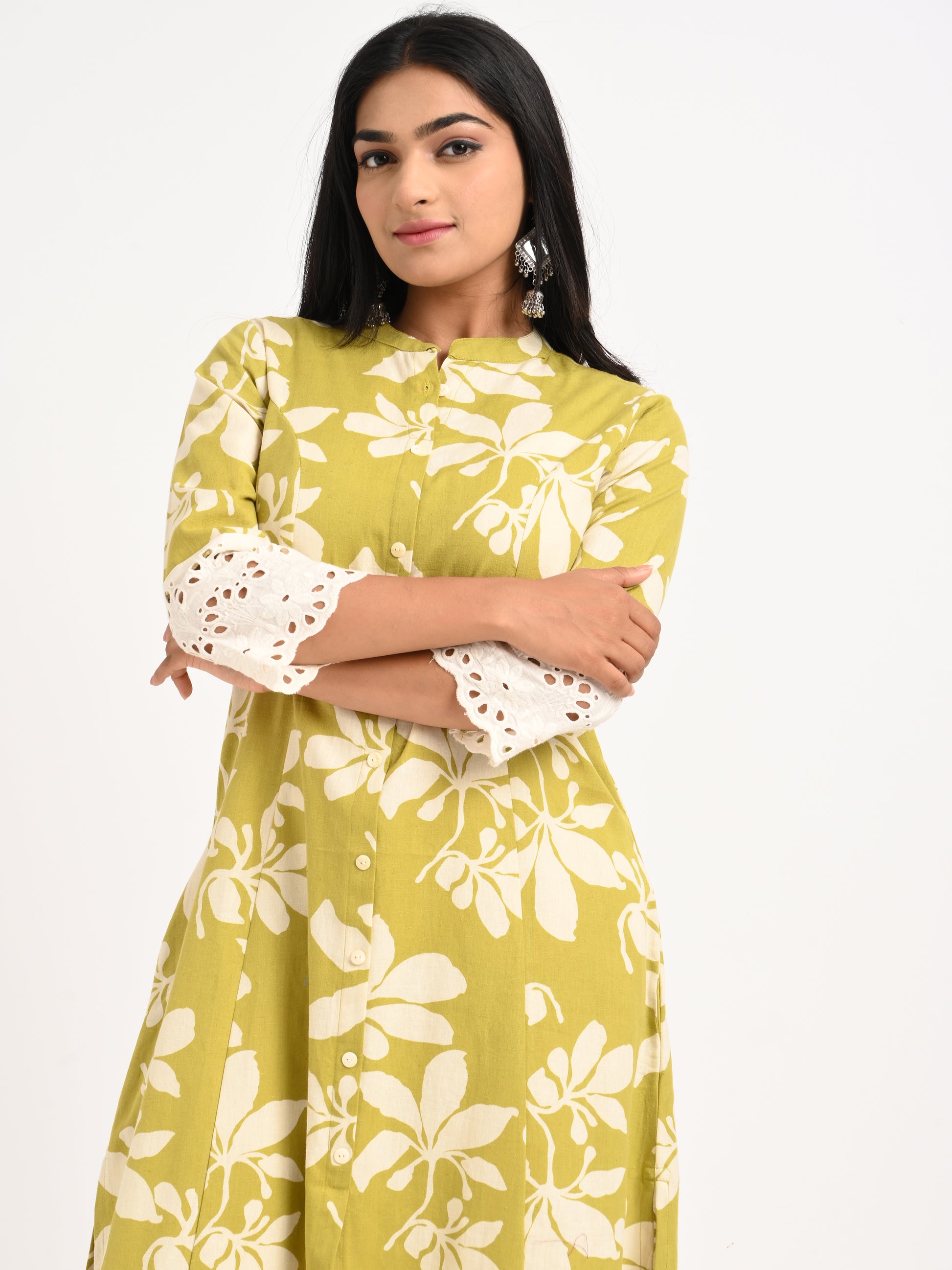 A lime-green kurta set adorned with bold floral prints, featuring a straight-cut kurta with three-quarter sleeves highlighted with lace detailing. Paired with contrasting straight pants, this set is perfect for casual outings and daywear.