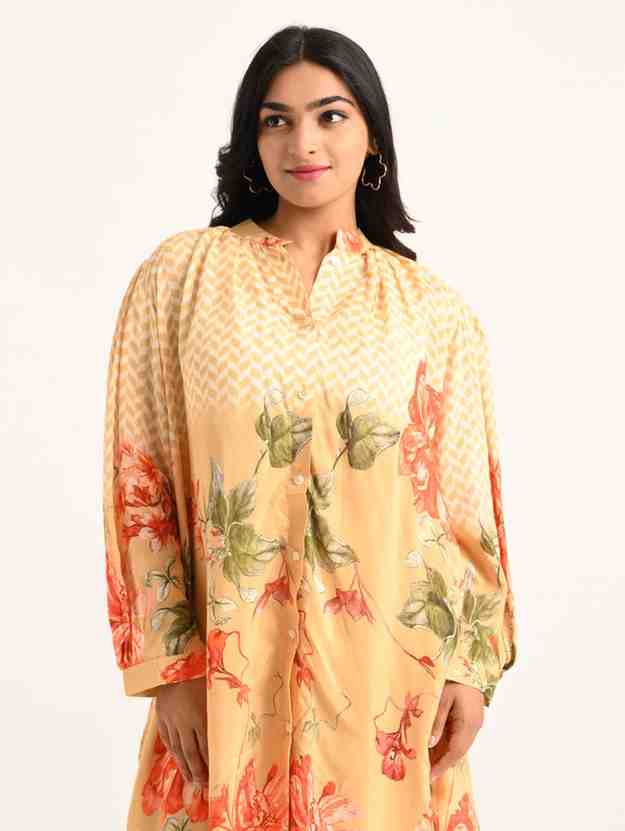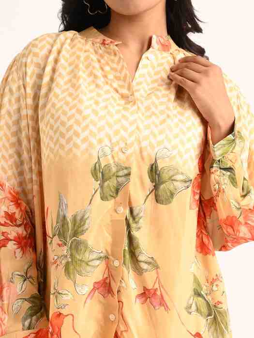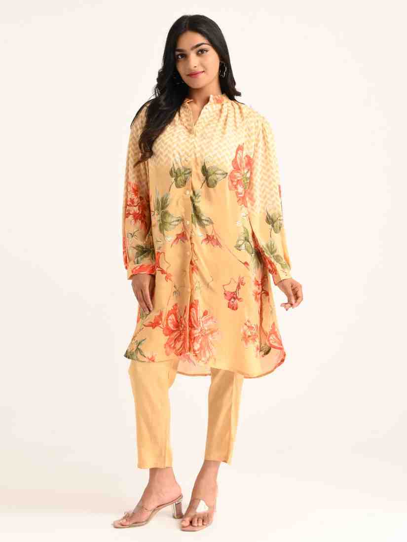 A chic co-ord set featuring a button-down top with bold floral prints and straight-fit trousers—designed for easy, everyday elegance.