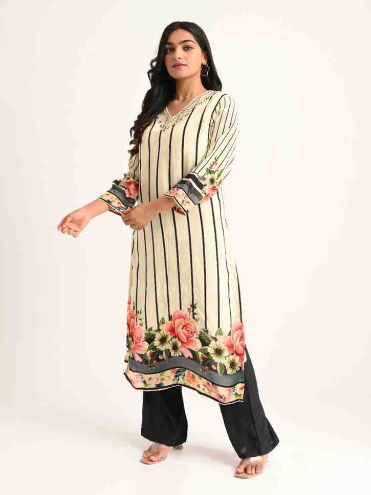 A classy three-piece set featuring a striped kurta with floral detailing, complemented by solid trousers and a printed dupatta—perfect for a refined everyday look.