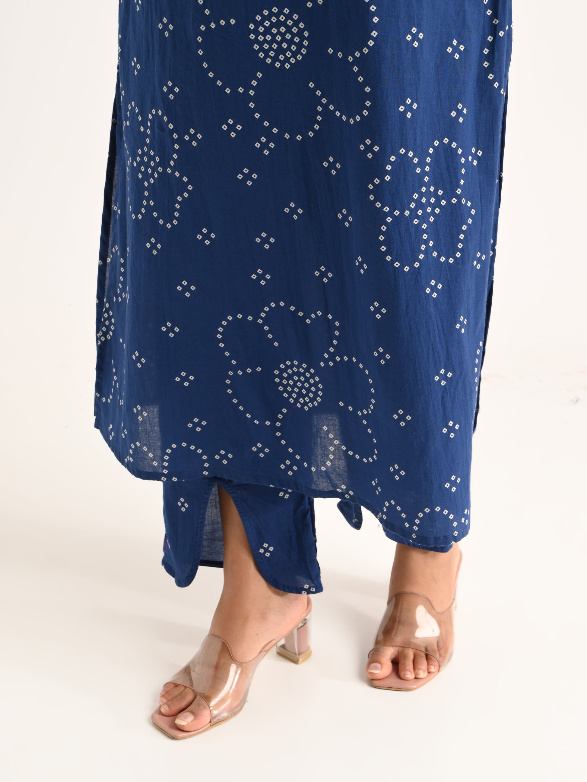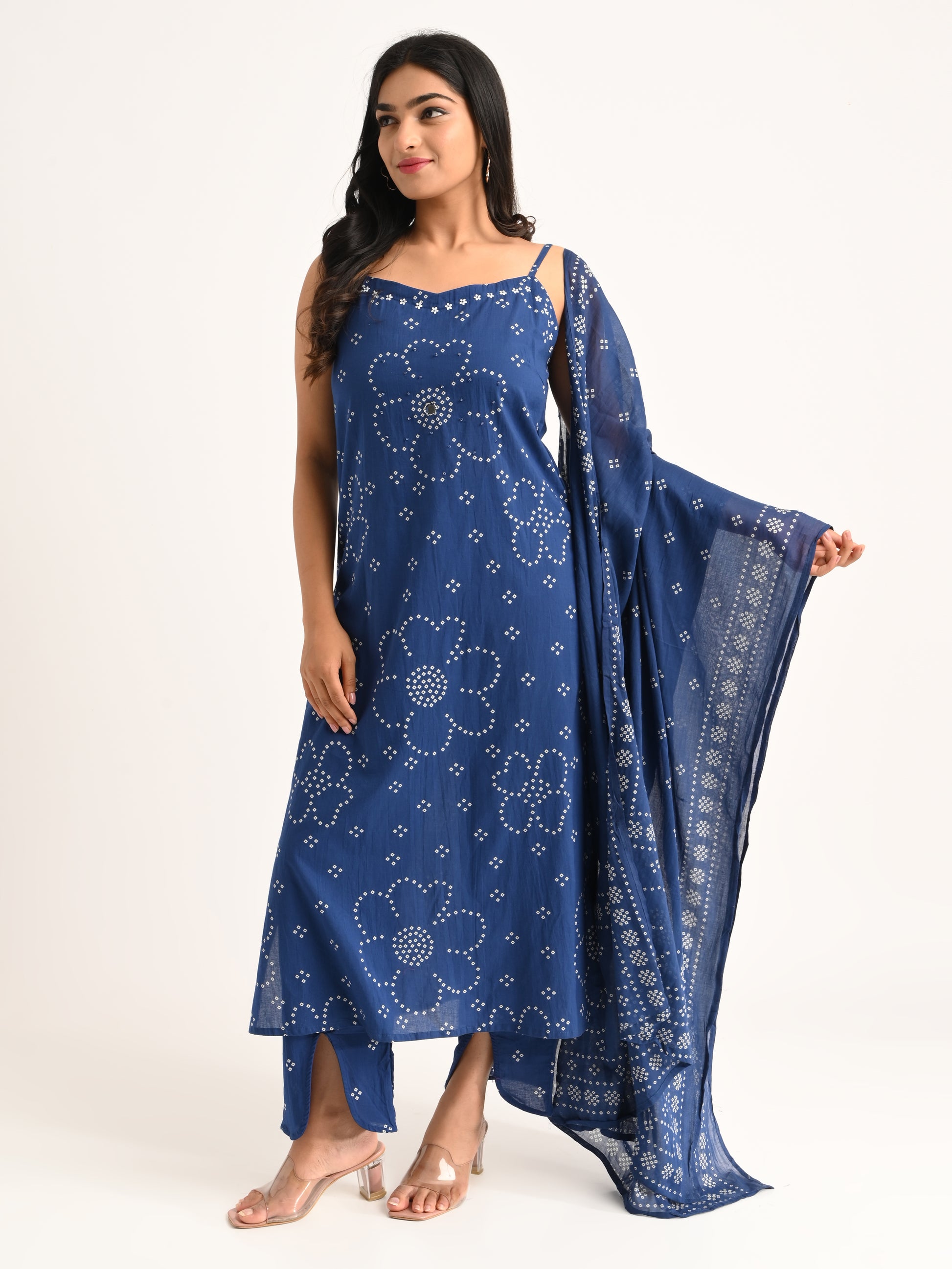 A breezy and elegant indigo blue kurta set featuring floral work with spaghetti straps, and a lightweight dupatta — perfect for effortless summer charm.