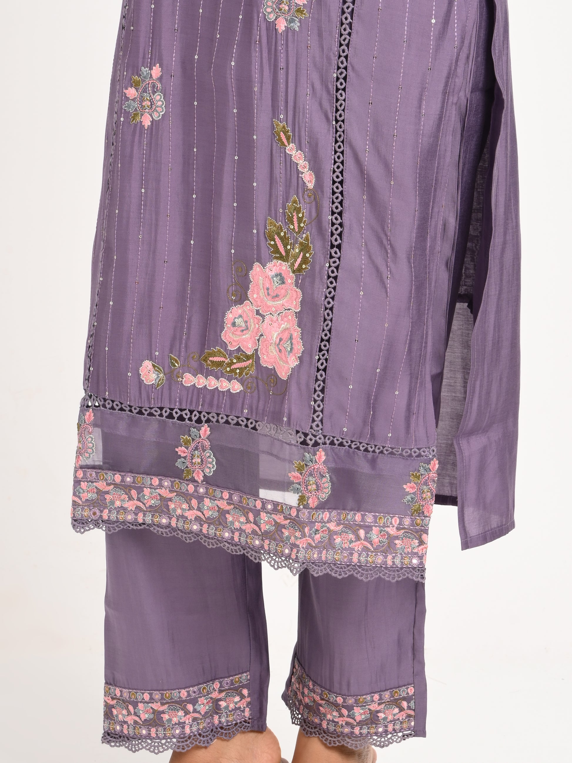 A stylish lavender suit set featuring subtle embroidery on the kurta with floral motifs and fine border work. Paired with straight pants and a beautifully printed dupatta, this set blends comfort with refined ethnic charm.