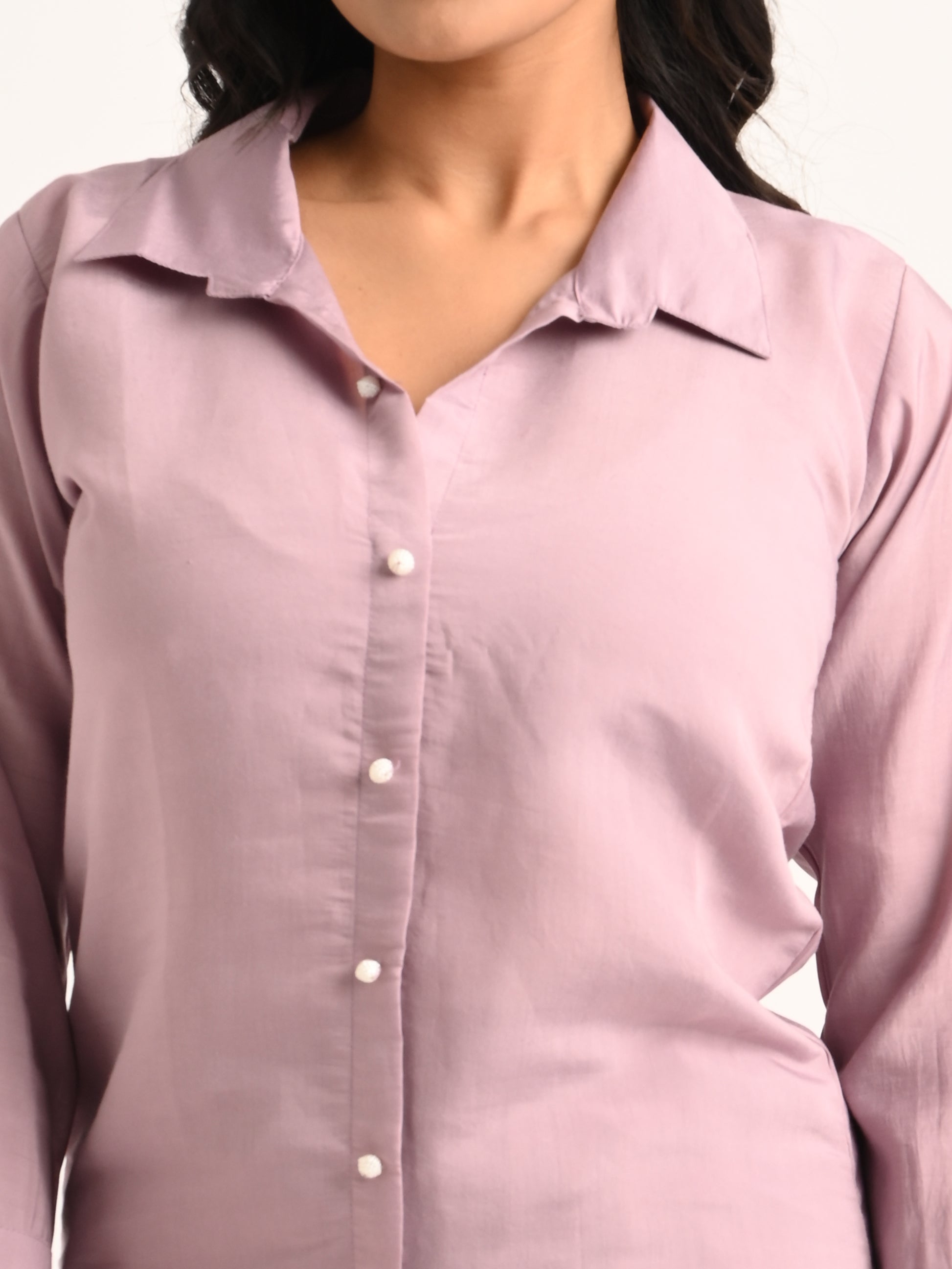 A soft lilac co-ord set featuring delicate rose embroidery at the hem of both the shirt-style top and straight-fit pants. Designed for a clean, modern look with subtle detailing, this set offers effortless style for casual or semi-formal wear.