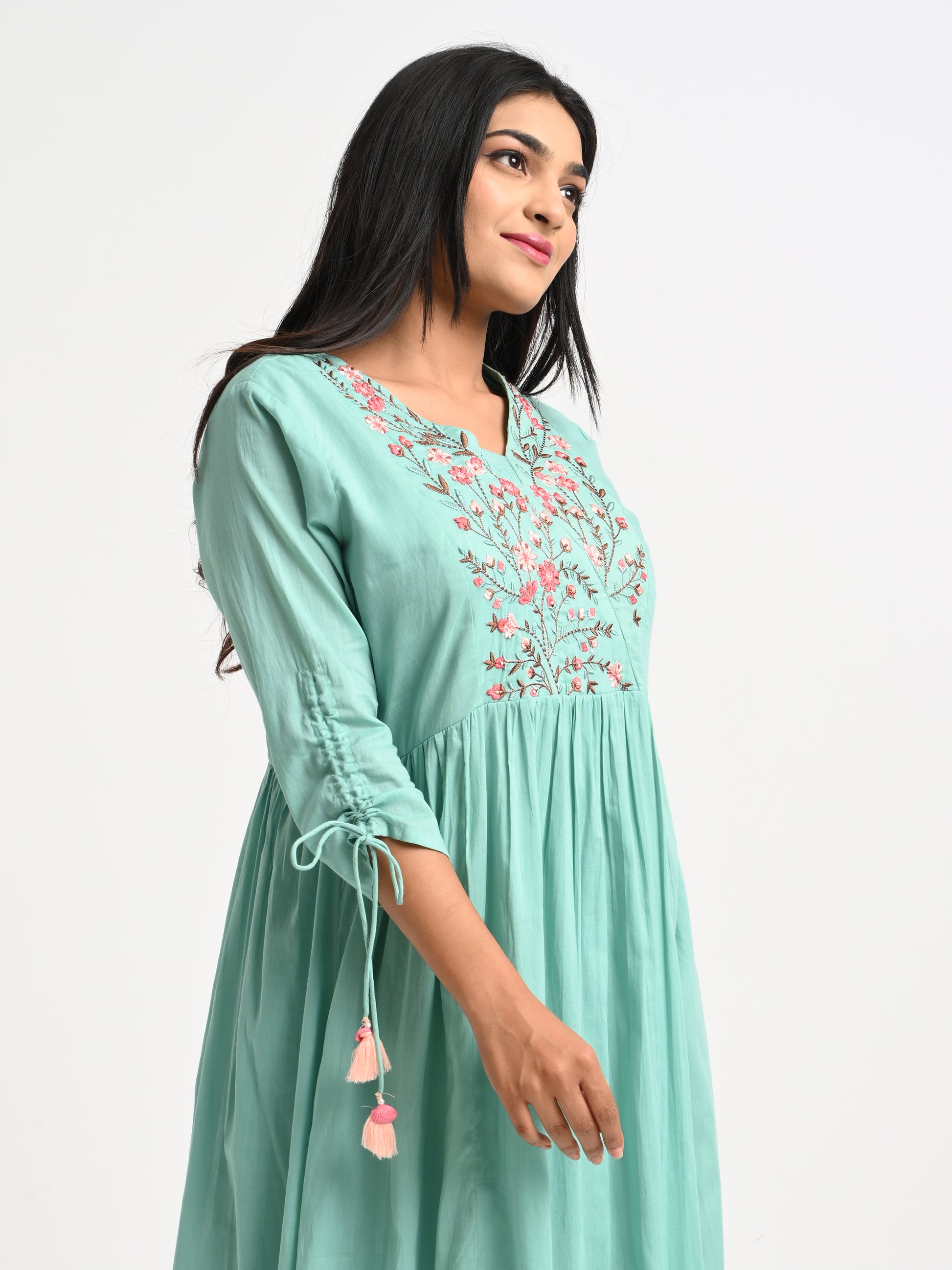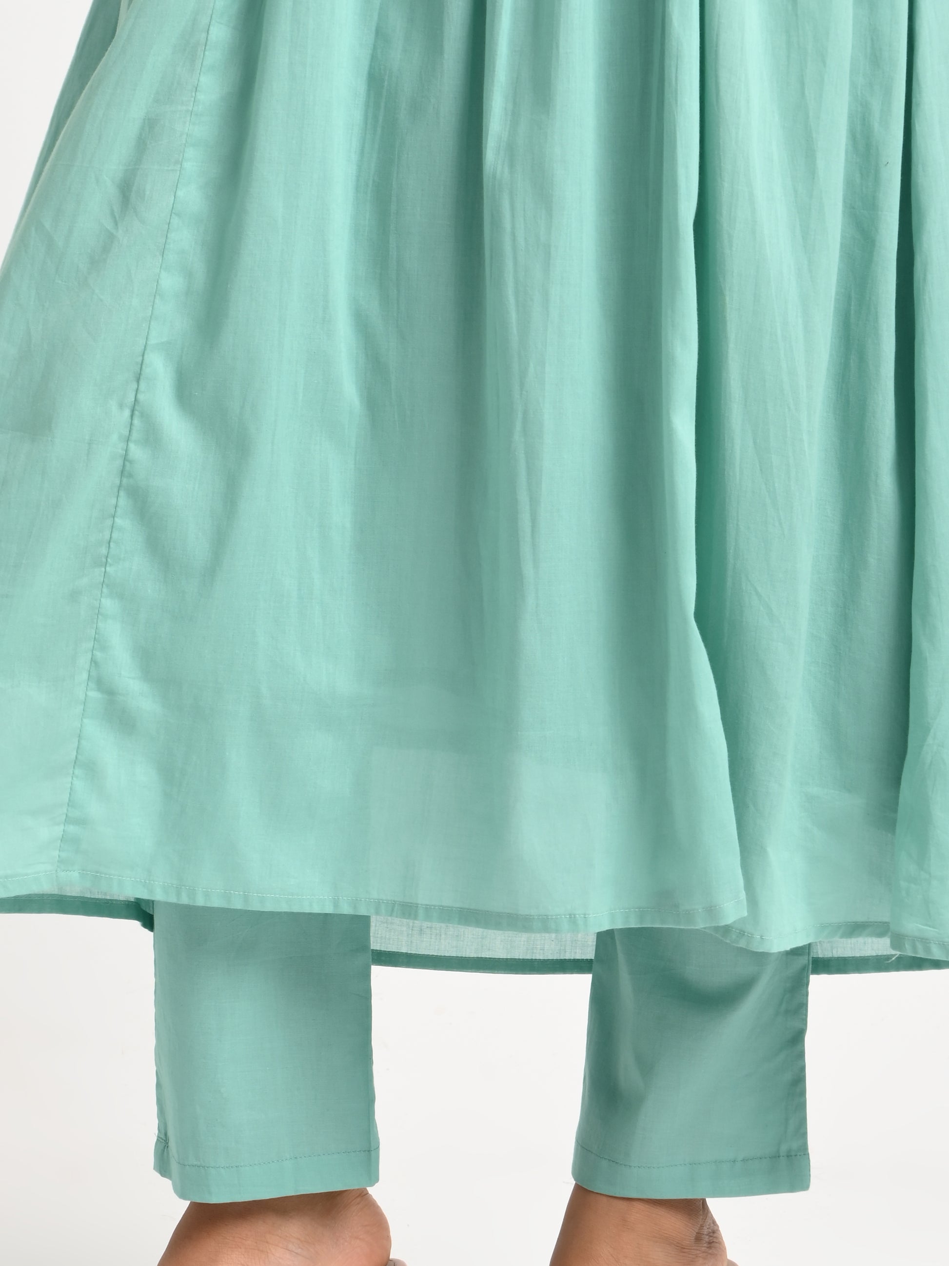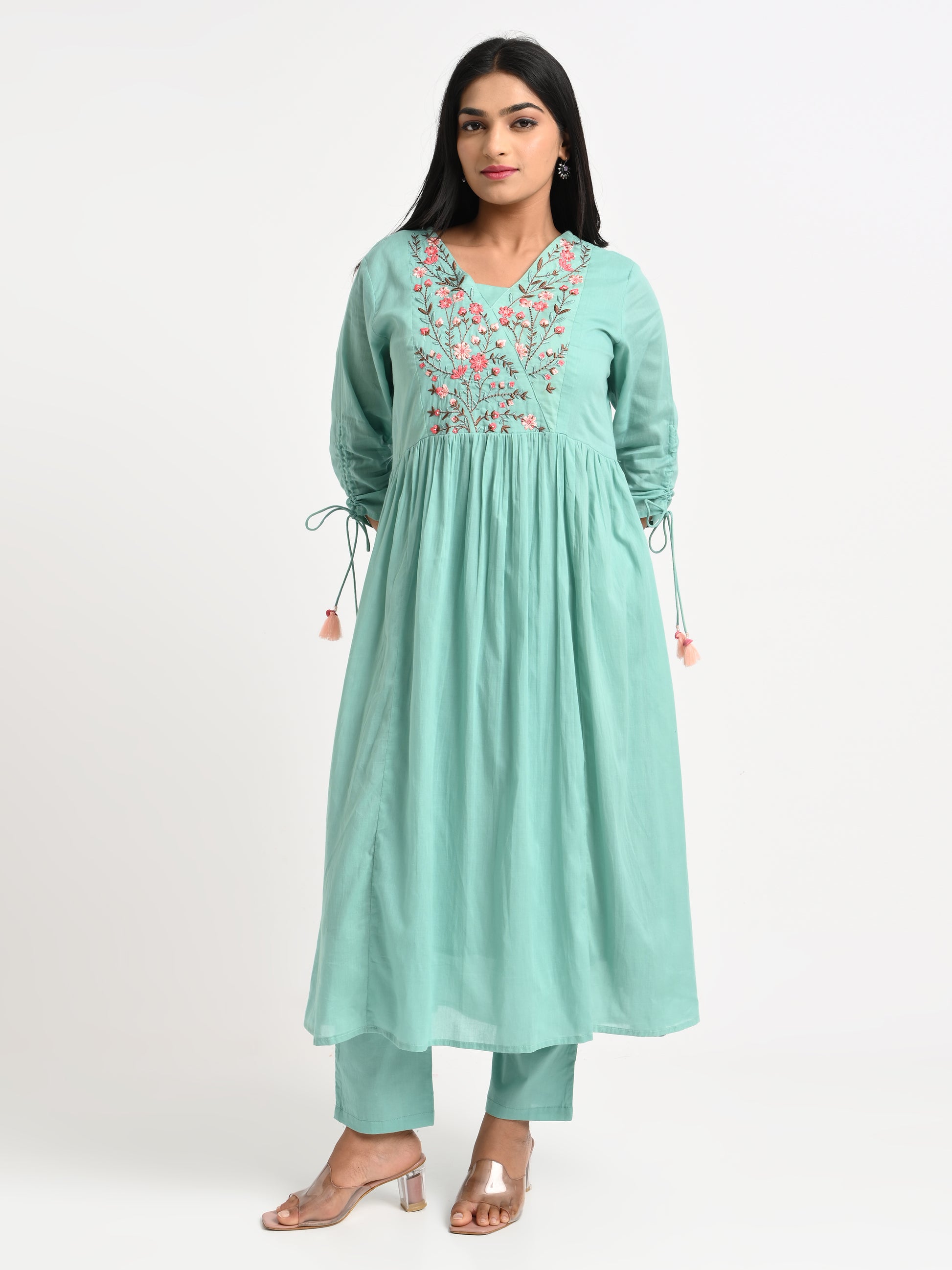 A graceful muslin kurta set featuring delicate embroidery on the yoke, paired with straight pants and a matching embroidered dupatta. Designed for a classy and simple look, perfect for festive and casual occasions.