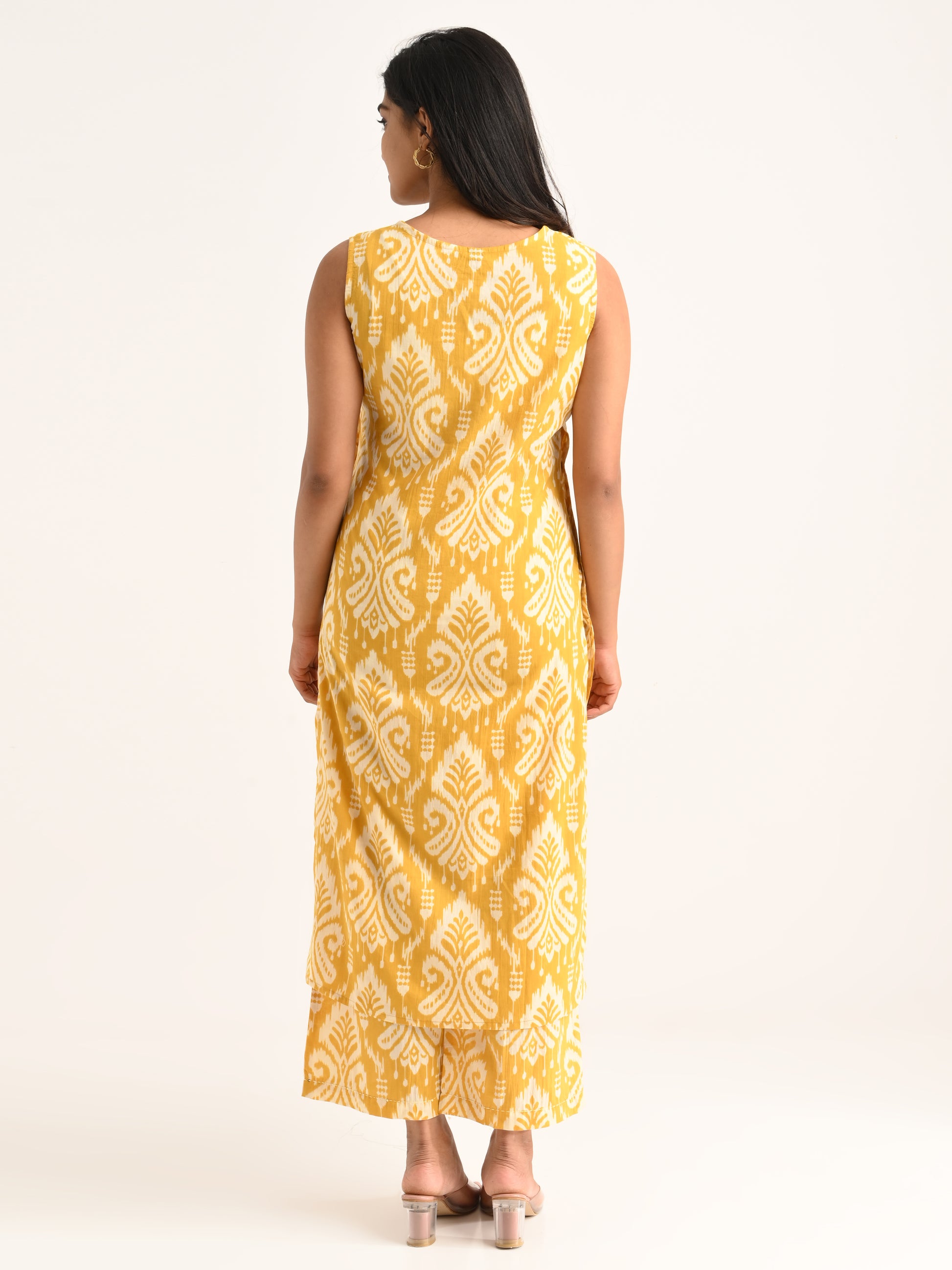 This sleeveless co-ord set features an all-over ethnic print in a vibrant mustard hue. The A-line kurta pairs effortlessly with straight pants, offering a chic and easygoing look — perfect for sunny day outings or casual get-togethers.