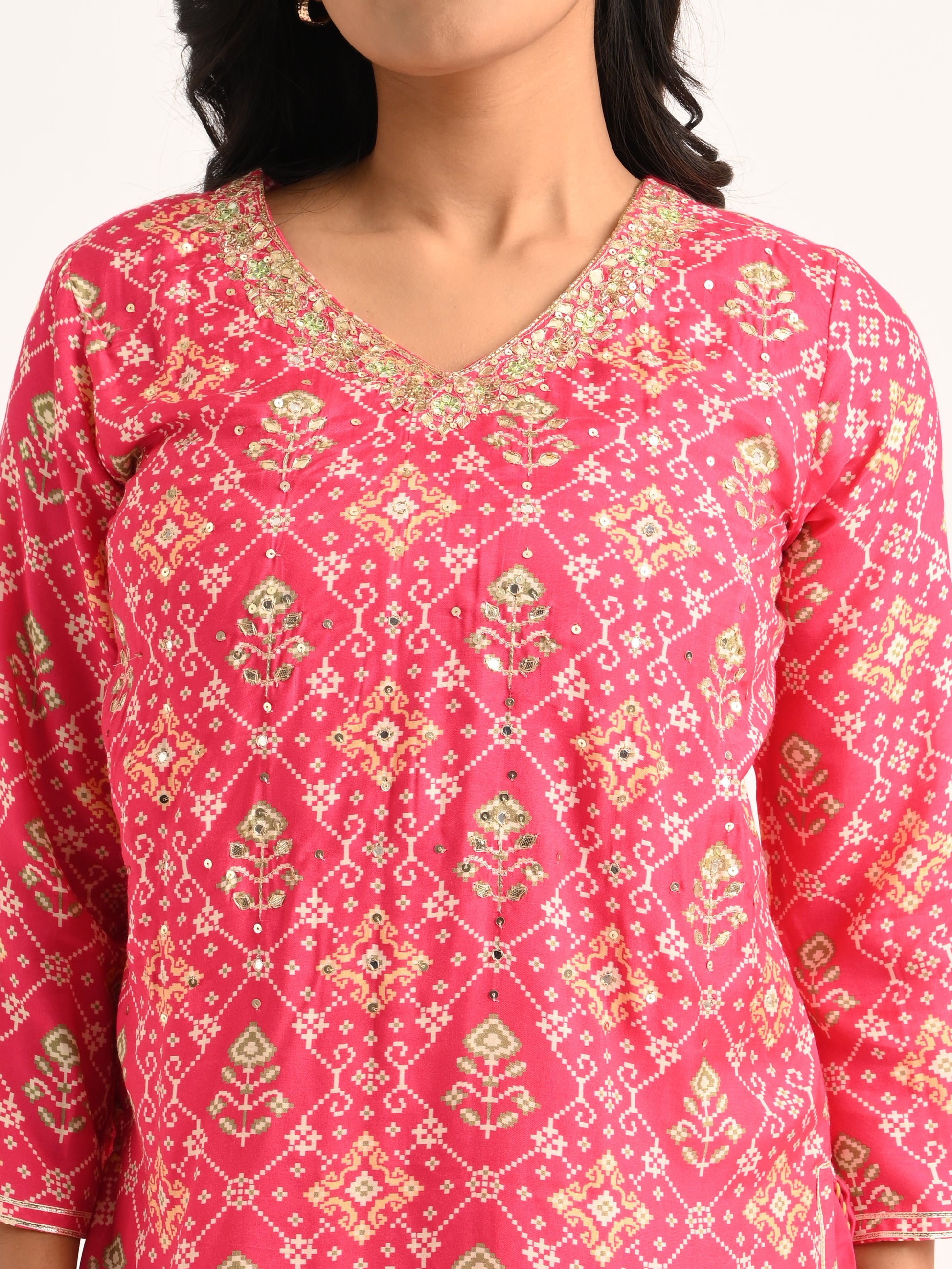 A vibrant kurta set featuring traditional , teamed with solid pants and a lightweight printed dupatta—perfect for festive mornings and casual gatherings.
