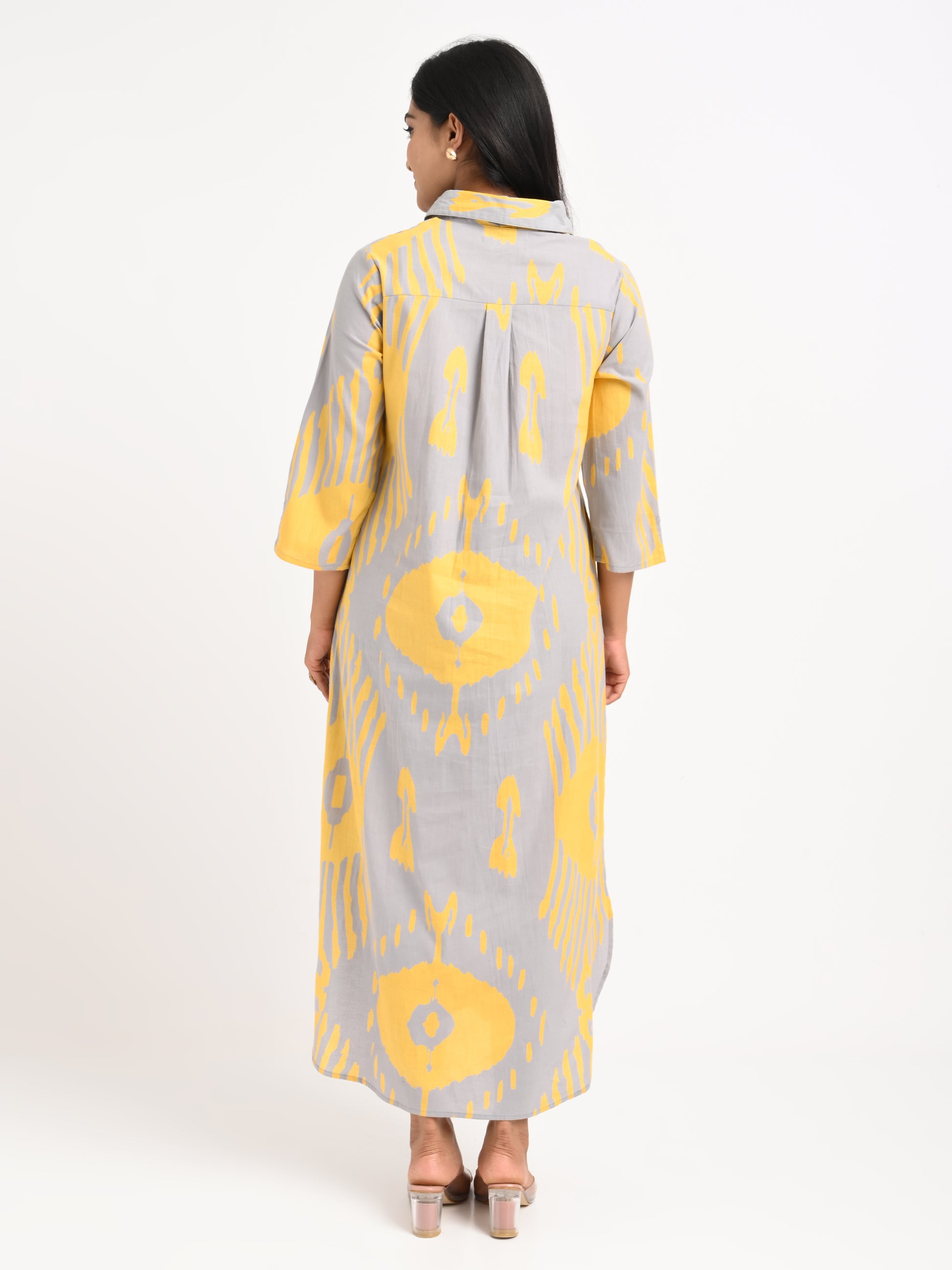 A trendy cotton shirt dress featuring bold abstract prints with a front button-down design and side slits. Perfect for casual outings, travel, or everyday chic styling.