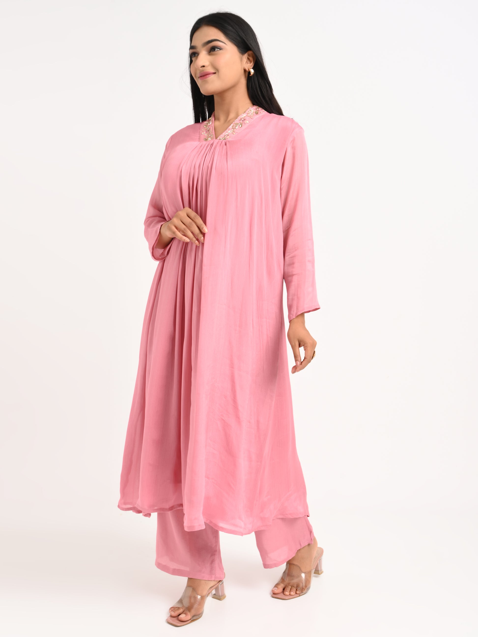 A classy and simple rose pink kurta set crafted in soft modal satin, featuring subtle pleat detailing along the front and sleeves. Comes paired with matching straight-fit pants and a lightweight dupatta to complete the graceful look.
