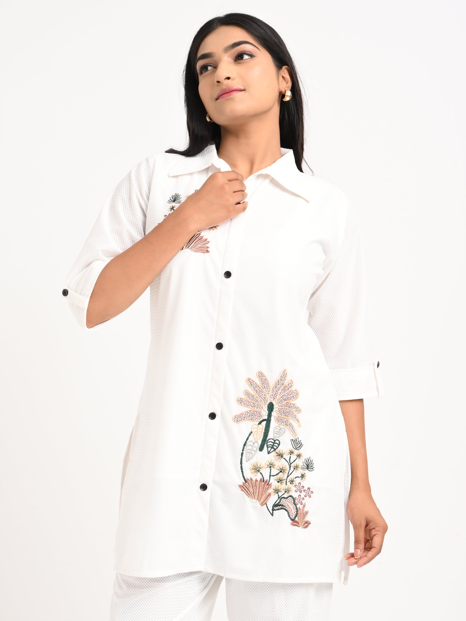 A crisp white co-ord set featuring a shirt-style top with delicate floral embroidery and matching straight-fit pants—ideal for elevated everyday wear with a polished touch.