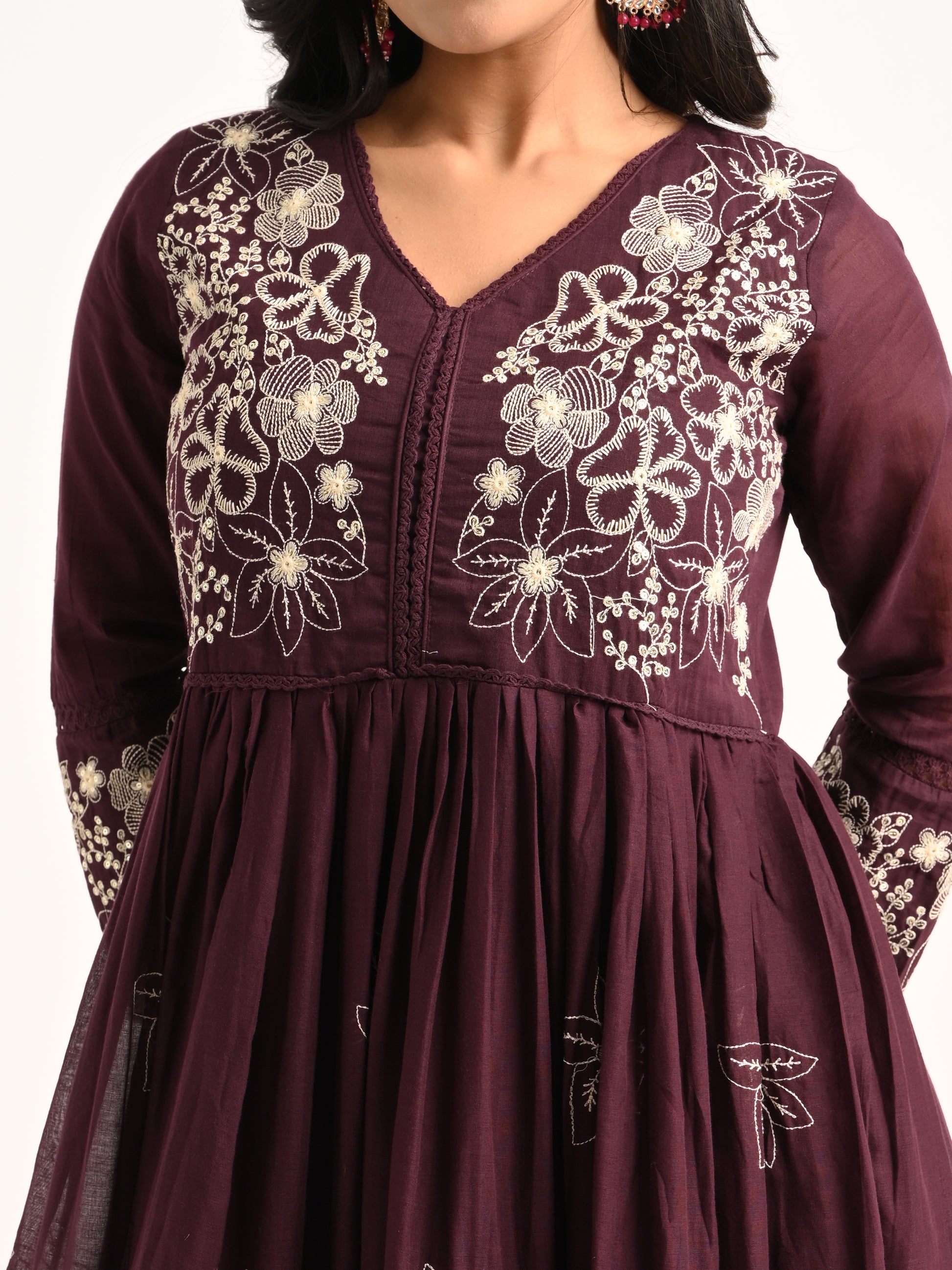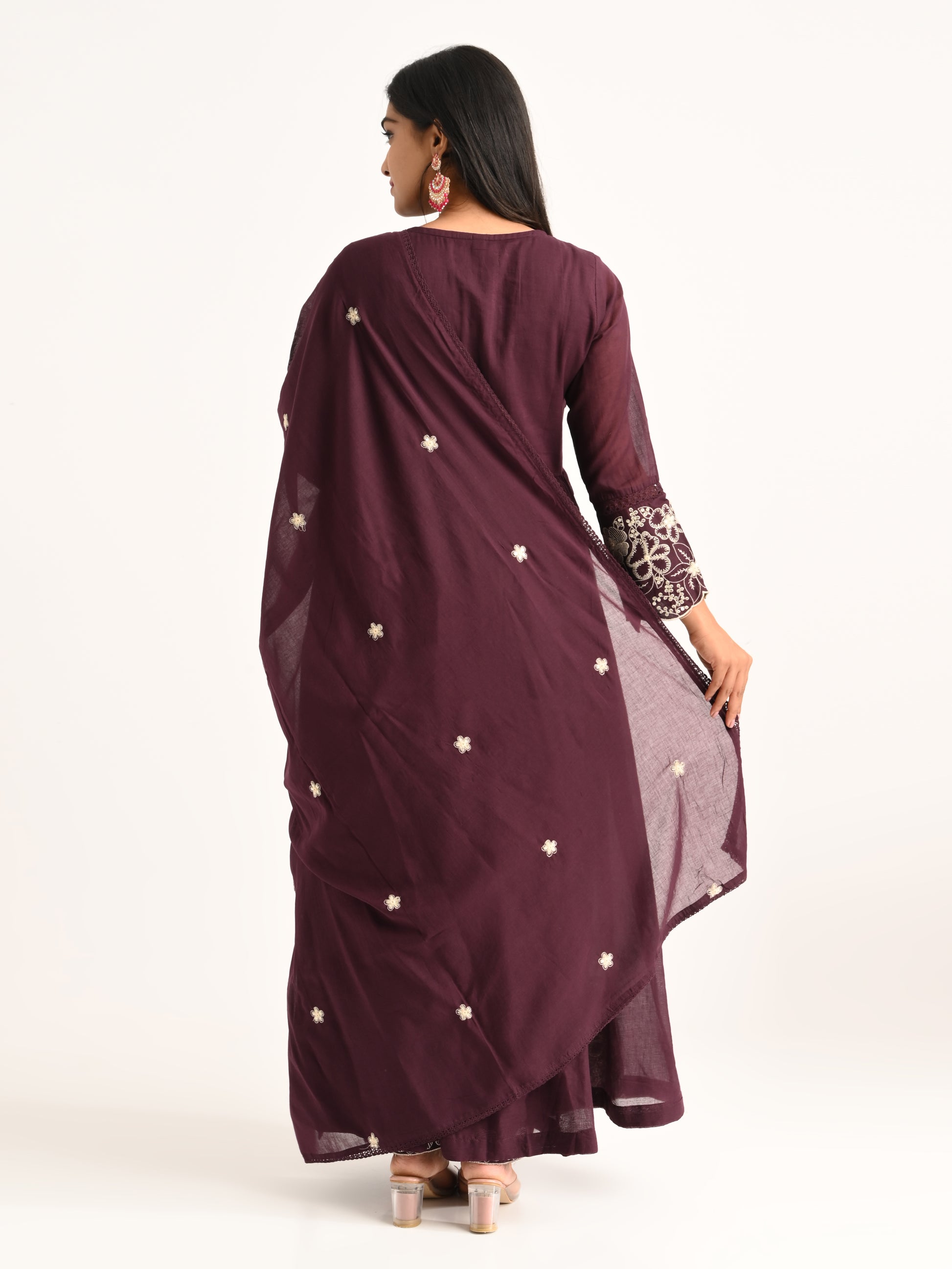 A graceful black 3-piece set featuring a flowy embroidered kurta with sheer sleeves, paired with matching straight pants and a lightweight dupatta. Detailed floral threadwork adds a refined charm to this versatile ensemble